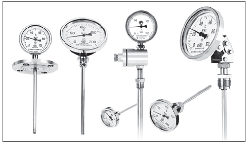 測(cè)量氣體和液體的溫度。與玻璃溫度計(jì)相比,它具有無汞損壞、讀數(shù)清晰、堅(jiān)固耐用的優(yōu)點(diǎn)。我生產(chǎn)多用途雙金屬溫度計(jì),規(guī)格品種齊全,質(zhì)量穩(wěn)定可靠,可廣泛應(yīng)用于工業(yè)、農(nóng)業(yè)、國(guó)防和科研領(lǐng)域的各個(gè)部門。雙金屬溫度計(jì)結(jié)構(gòu)特點(diǎn)和工作原理雙金屬 溫度計(jì)(以下簡(jiǎn)稱溫度計(jì))使用螺旋加熱器雙金屬板作為溫度傳感元件,并將其安裝在保護(hù)套中,一端固定(固定端),另一端(自由端)連接到薄軸上,軸端帶有指針。當(dāng)溫度變化時(shí),溫度傳感元件的自由端立即旋轉(zhuǎn),并通過細(xì)軸驅(qū)動(dòng)指針以指示刻度盤上的溫度變化。直行溫度計(jì)通過轉(zhuǎn)向傳動(dòng)機(jī)構(gòu)驅(qū)動(dòng)指針。外殼材料包括鋼板、鑄造鋁合金和不銹鋼板。可調(diào)角度溫度計(jì)的頭部可借助波紋管、轉(zhuǎn)角機(jī)構(gòu)和其他部件從角度調(diào)整為直線或從直線調(diào)整為角度。